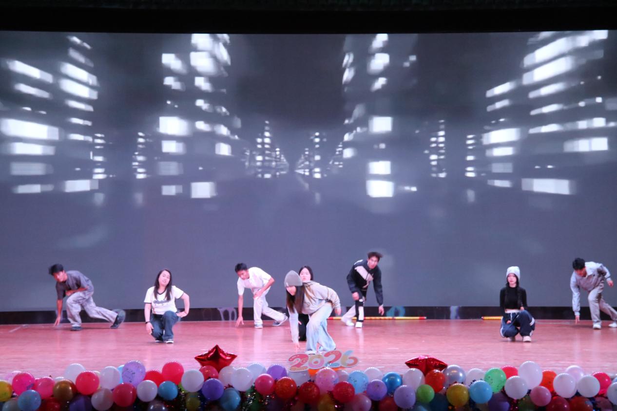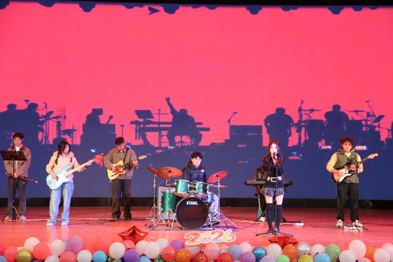 晚会伊始,一段精心制作的年度回顾视频缓缓播放,生动再现了世界杯体育官方网站2025年在学科建设、学生培养、校园活动中的高光时刻与暖心瞬间,勾起全场师生的共同回忆。随后,大学生艺术团乐队带来《月牙湾》《一路向北》《茶底世界》三首歌曲联唱,悠扬的旋律瞬间营造出温馨的节日氛围,为汇演拉开序幕。