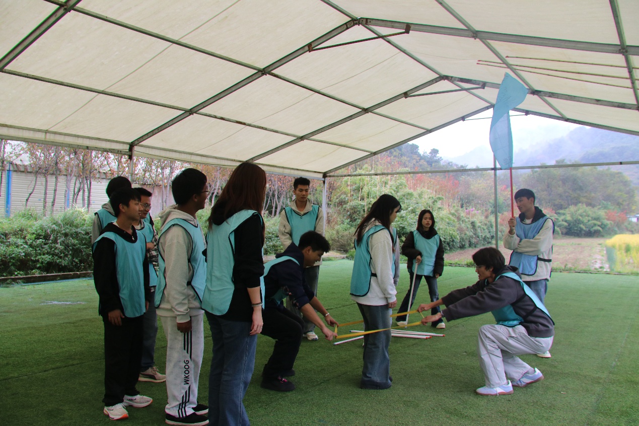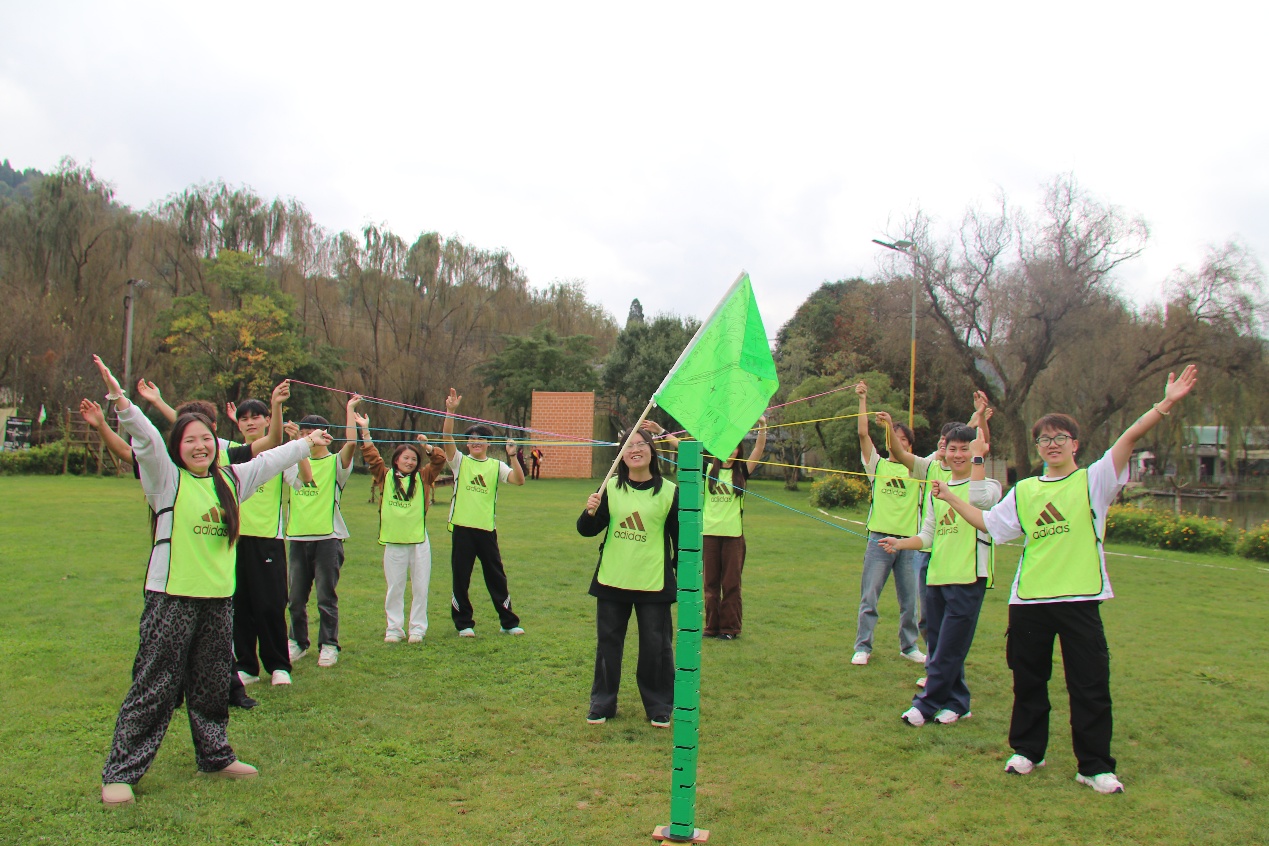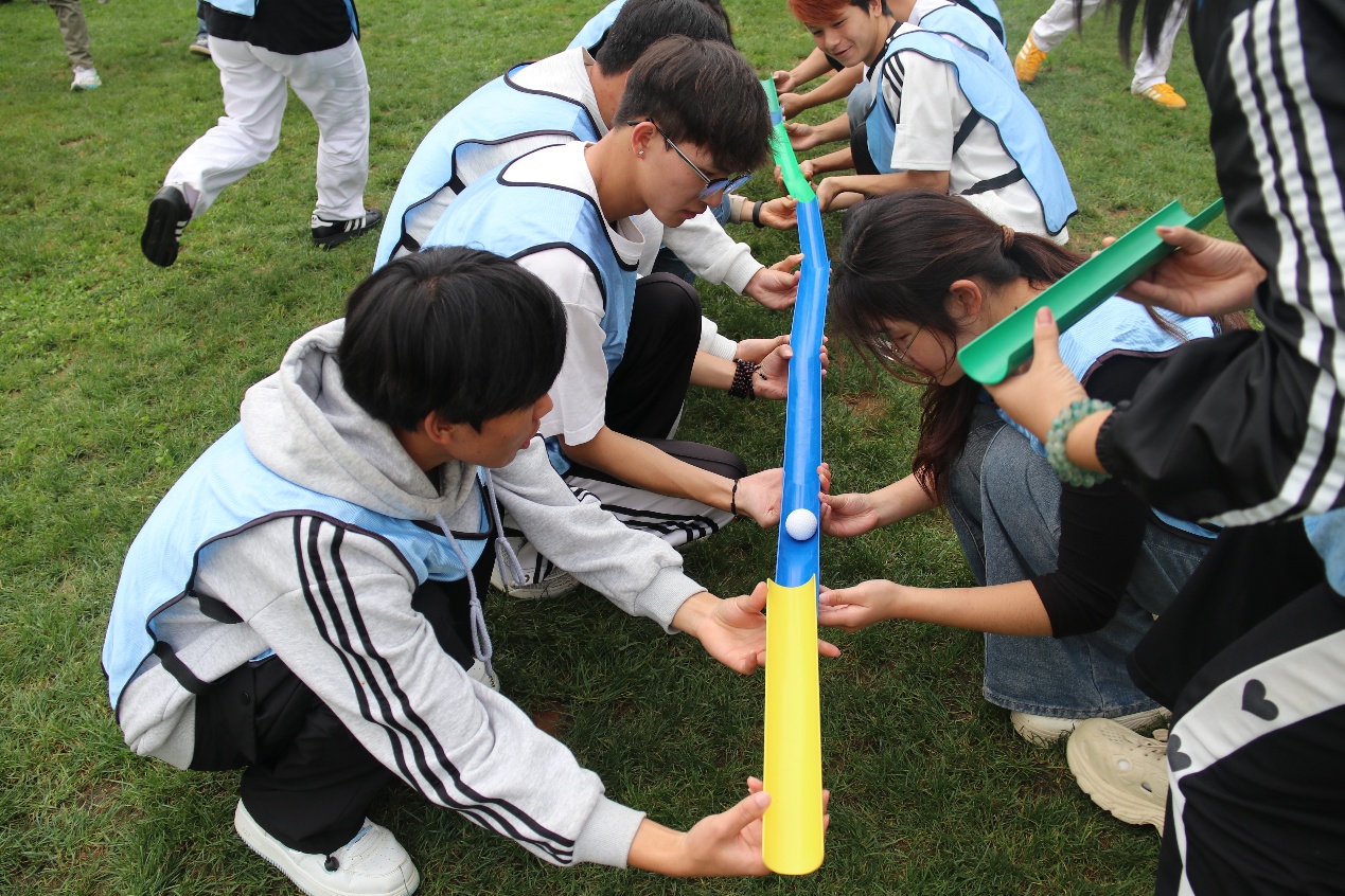 在专业教官的指导下,同学们通过随机报数迅速组建团队,共同完成了队名、口号和队旗的设计,并进行了风采展示,快速融入了集体氛围。随后,各小队相继参与了“珠行万里”“鼓动人心”等经典协作项目。这些活动寓教于乐,不仅考验了队员间的默契与沟通,更让大家深刻体会到资源整合与信任协作的重要性。