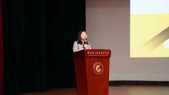 随后,云浮市科特机械有限公司总经理助理贺凤文、云浮市利机石材有限公司副总经理陆庆云依次进行了宣讲。他们通过播放宣传片、PPT等方式,从公司概况、福利待遇、企业文化、职业发展、食宿环境等方面给同学们作了详细介绍,并向同学们推荐介绍了微信公众号,方便同学们进一步了解相关信息。