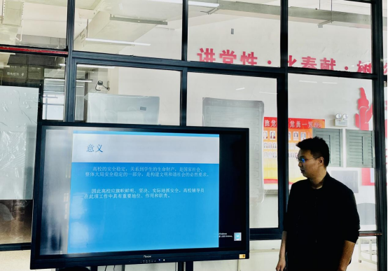 会议伊始,辅导员工作室成员王亚文结合个人工作经验和对安全工作问题的思考,主要从安全工作的意义、安全教育方法、安全事故应急处理、安全责任风险等方面进行讲解。他指出,高校安全稳定关系到师生的生命、财产安全,既是高校落实立德树人根本任务的重要前提,也是新形势下高校加快“内涵式发展”、 推进“双高”建设的坚实基础。他认为,各辅导员可以从以下几方面进行提升:一是要积极学习、掌握安全教育宣传知识,结合学生自身特点、班级特点、校园环境特点等总结常见安全问题,及时引导学生主动分析问题原因,不断提高安全教育能力。二是要及时学习学校的相关安全事故处理流程和应急预案,第一时间处理学生安全突发事件,并加强后期的心理疏导和安全教育。三是要提升安全责任意识,提前预判安全风险,做好安全宣传教育和安全工作相关材料的整理归档。