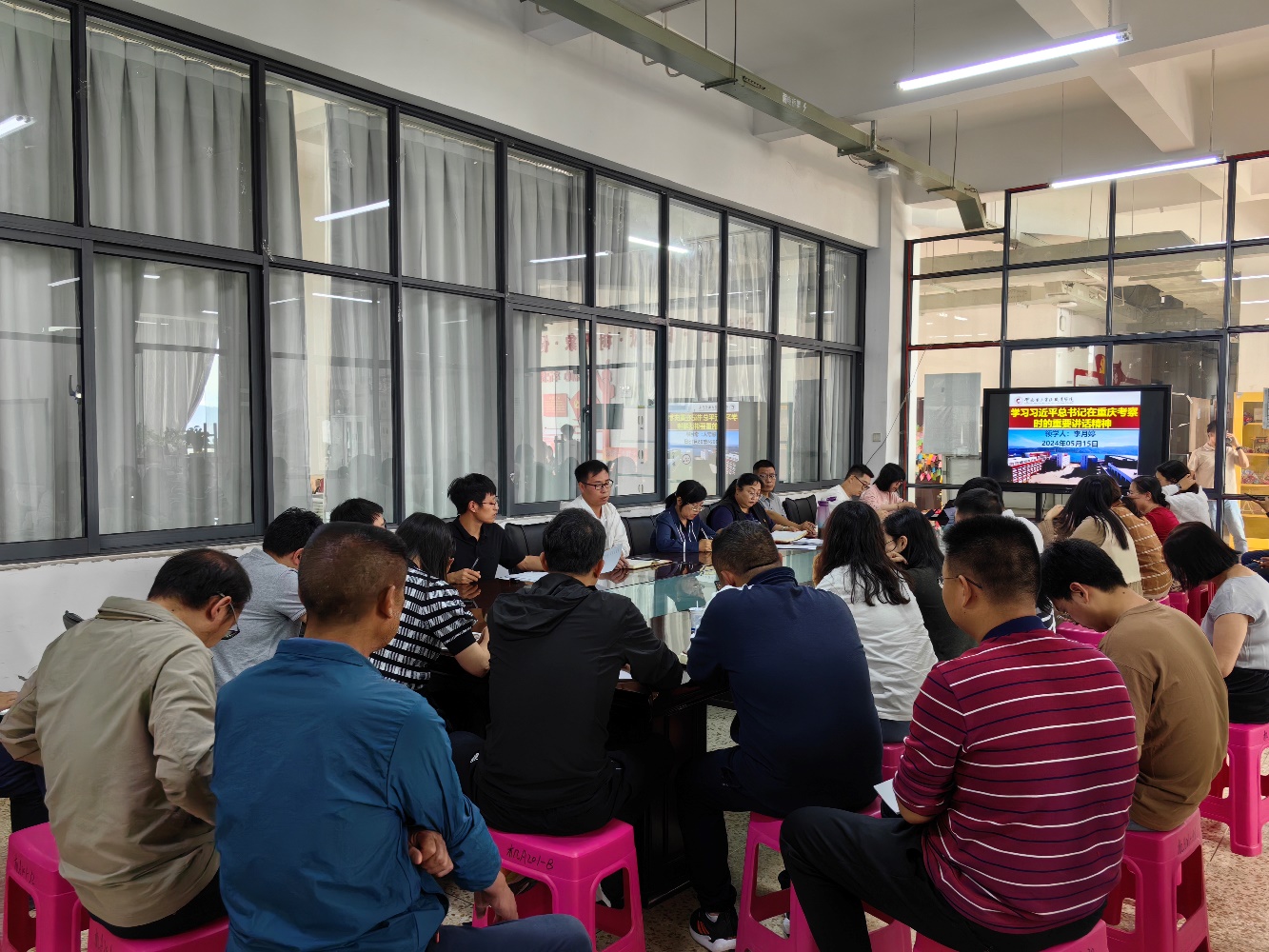5月15日中午13:00,世界杯体育官方网站在明尚楼A201开展了2024年5月份第一次教职工政治理论学习会。本次政治理论学习会由学生党支部宣传委员李月婷带领全体教职工学习了习近平总书记在重庆考察时的重要讲话精神。