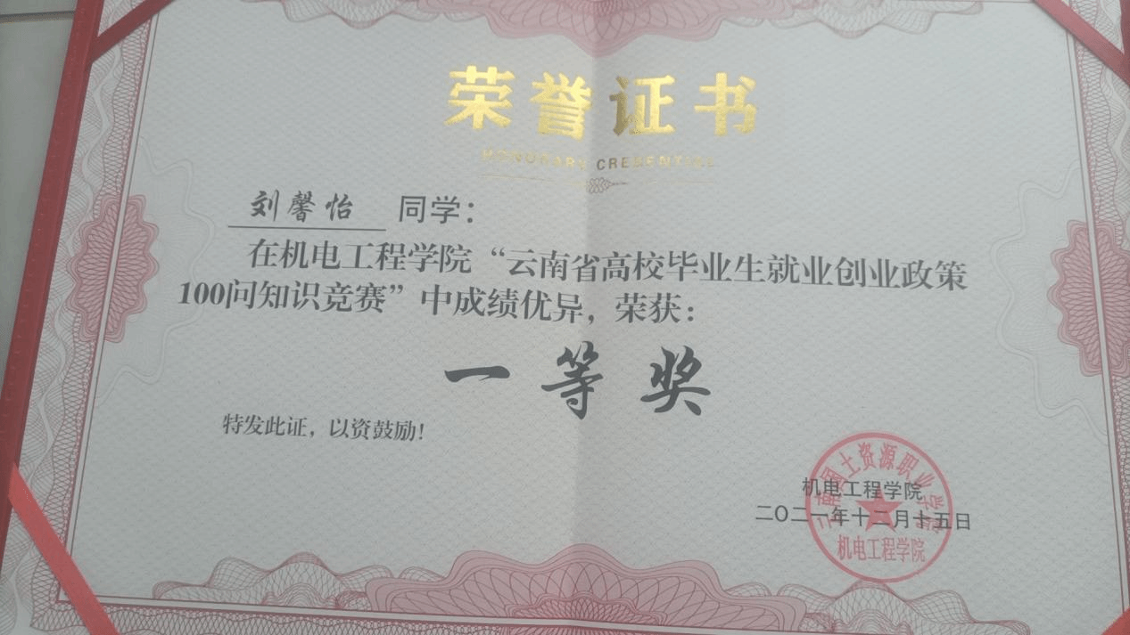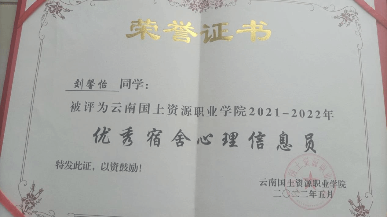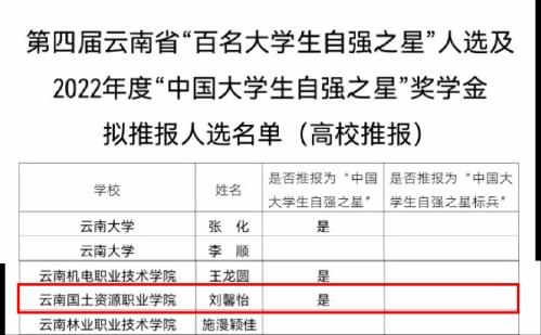 近日,由共青团云南省委、云南省学生联合会、云南省青少年发展基金会、华能澜沧江水电股份有限公司联合开展的第四届云南省“百名大学生自强之星”寻访活动结果已揭晓,世界杯官网2020级安管3班团支部刘馨怡同学被评为云南省“百名大学生自强之星(创新创业类)”。