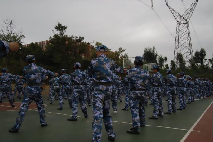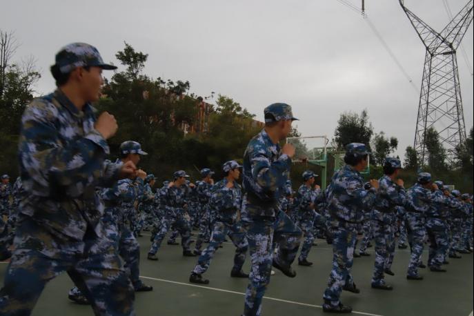 在夕阳的余晖中,是教官严格训练的场面,是同学们刚毅充满活力的脸庞 ,从摆臂到踢腿,从握拳到绷腿,每一个动作教官都亲自示范与分解指导。