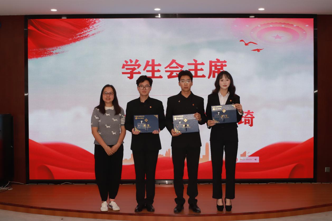 第二项议程:颁发聘书。张颖书记为团支部副书记和学生会主席团颁发聘书,马玲老师为各部门部长颁发聘书,团总支副书记、主席团成员为副部长颁发聘书,部长为各部门干事颁发聘书,各部门依次完成颁发。通过仪式感激励干部们不忘初心,脚踏实地开启新征程。