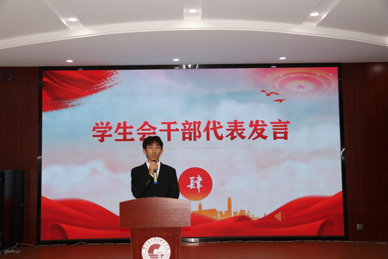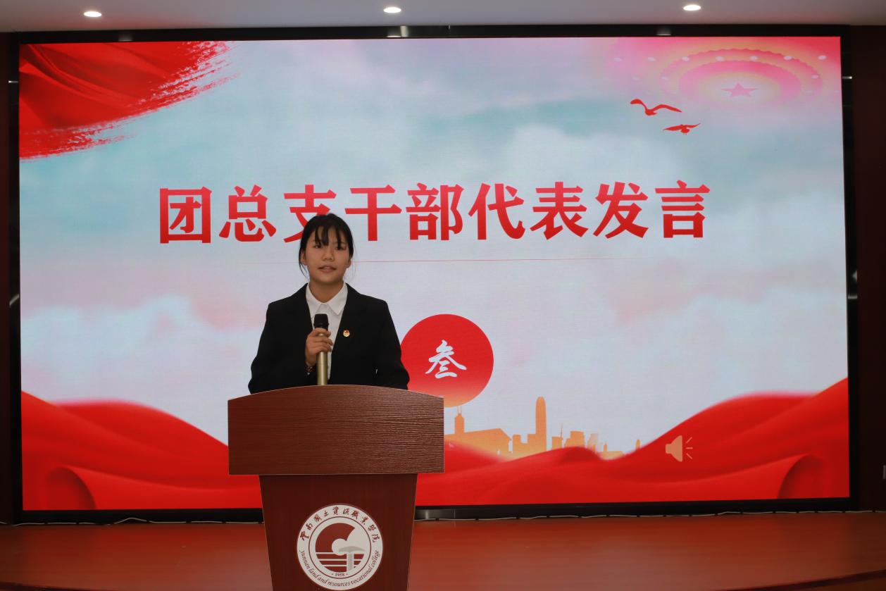 第三项议程:团学干部代表发言。团总支第二课堂中心部长张丽表示,在机电大家庭她收获知识并成长为有用之人,她认为团学工作与所有同学紧密相连,要注重沟通与合作。学生会权益服务部部长马国银表示,今后将注重部门建设、提升部门凝聚力,倡议各部门要为学院发展贡献力量,共创美好校园生活。