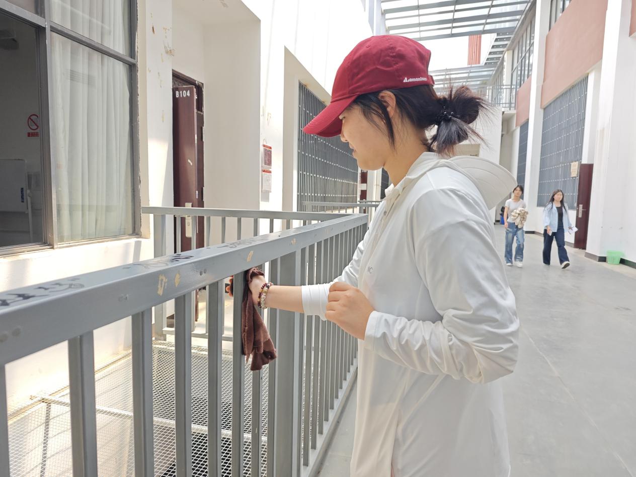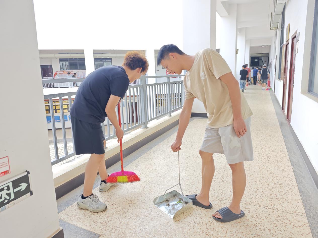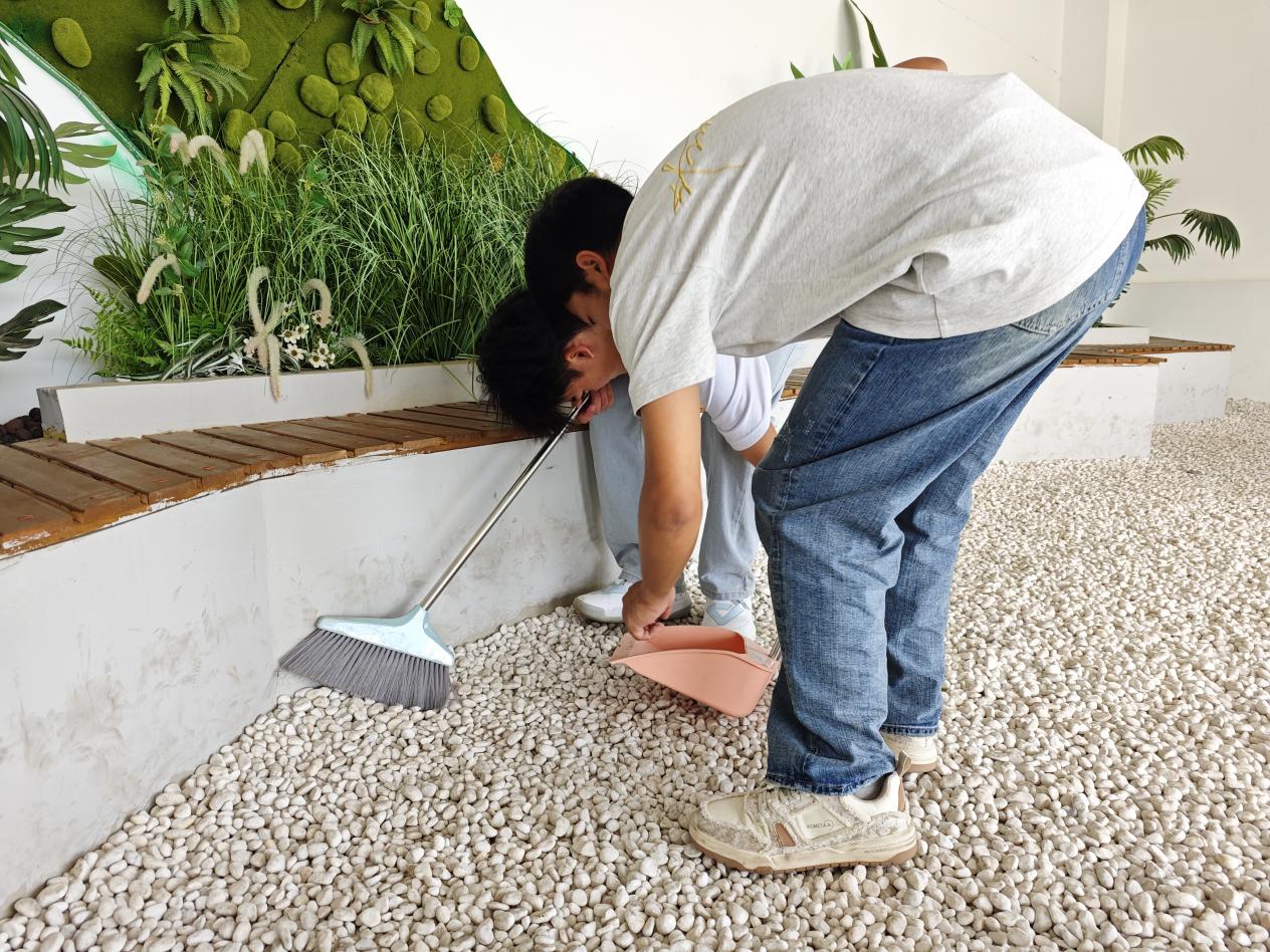 活动伊始,同学们准时在明尚楼A201会议室集合。学生会主席团成员李子琦现场组织工作,有序发放扫帚、抹布等清洁工具,并根据清洁区域的面积与任务量科学分配人员。打扫过程中,大家分工明确、配合默契,全程保持高效有序。任务完成后,同学们自觉将工具分类归位,确保物资整理规范。
