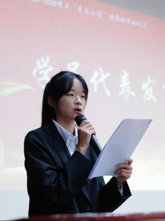 第三项议程:学员代表李玉花发言,她结合当代青年特点,从个人感受出发,倡议大家坚定理想,乐观自信,努力学习,勇担责任。