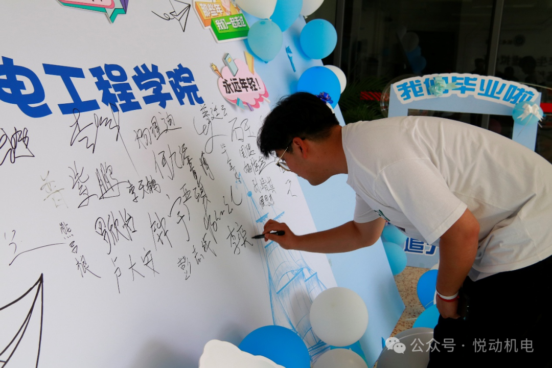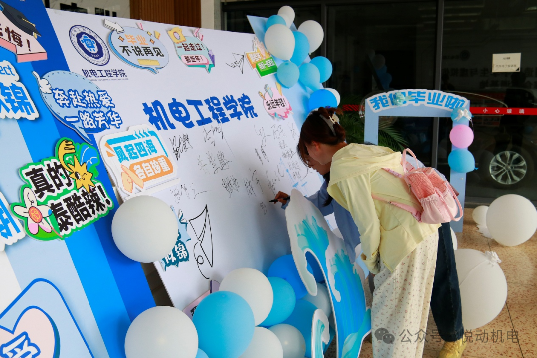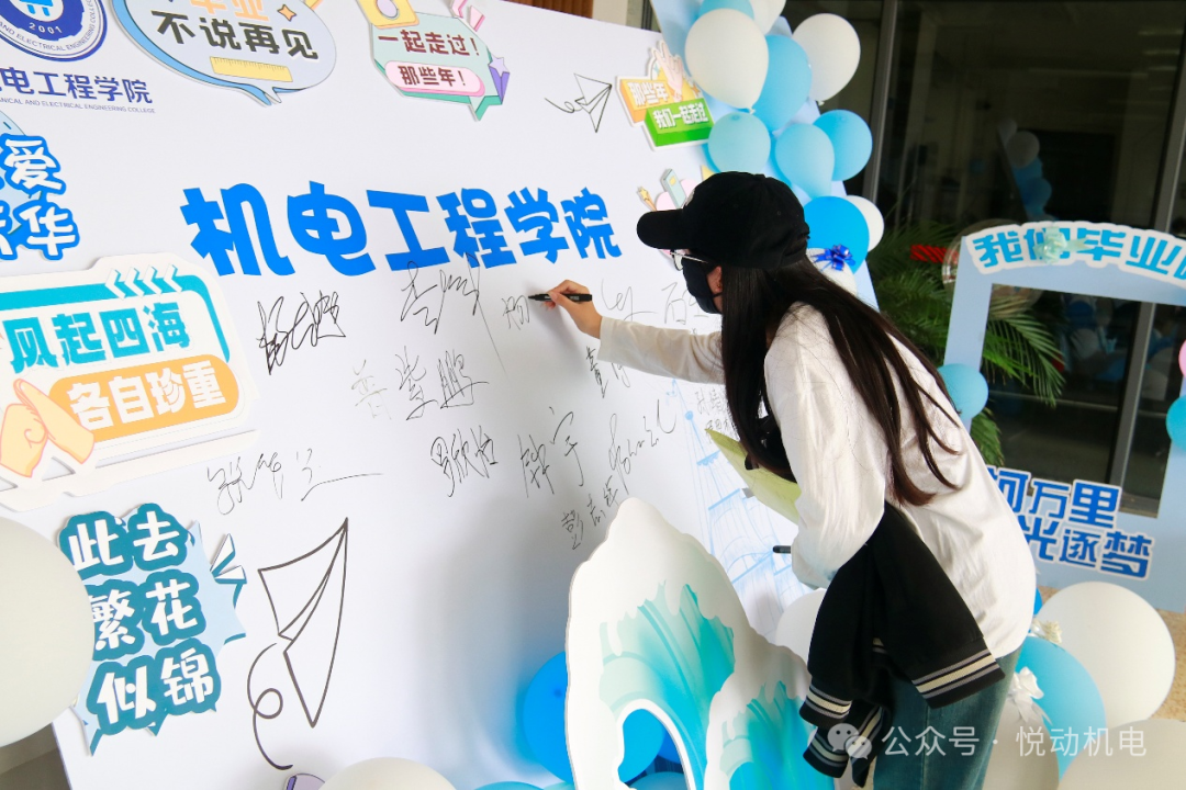 签到墙前,毕业生们写下自己的名字,与朋友合影留念。屏幕里滚动播放的校园生活影像,引得不少人驻足观看,回忆过往。