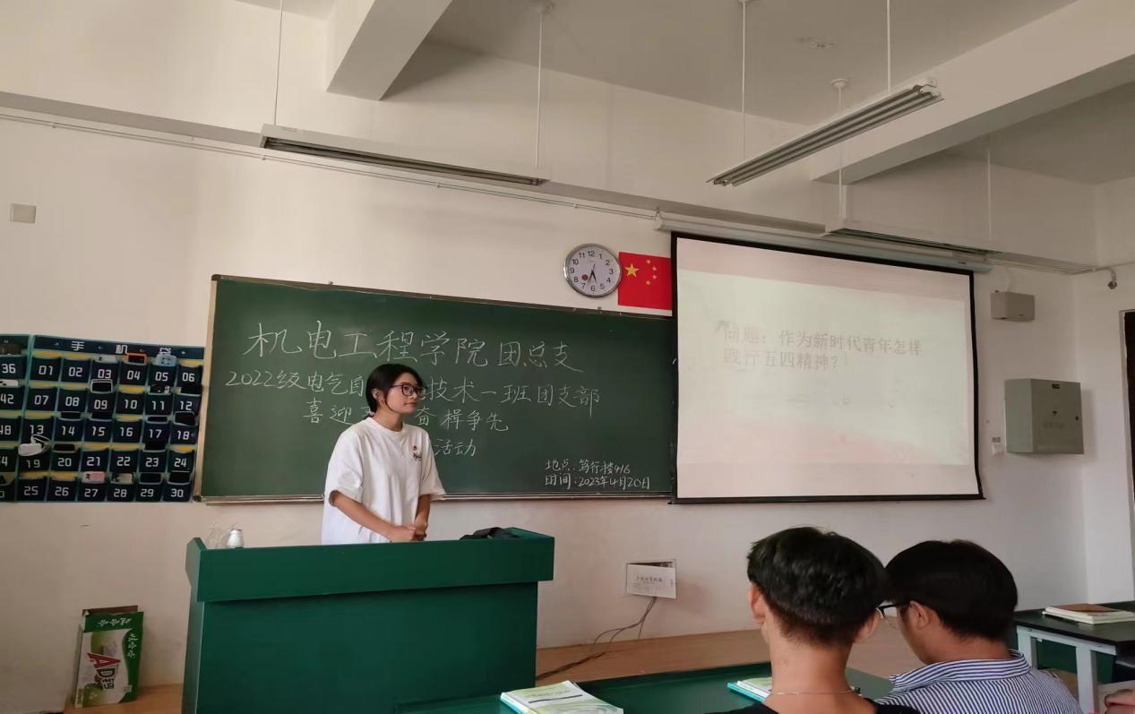 4月20日下午17:10,世界杯体育官方网站2022级电气自动化技术1班以“喜迎五四,奋楫争先”为主题,在笃行楼416举行了四月份的主题团日活动。本次活动由副班长段金娈主持,全班同学共同参与。