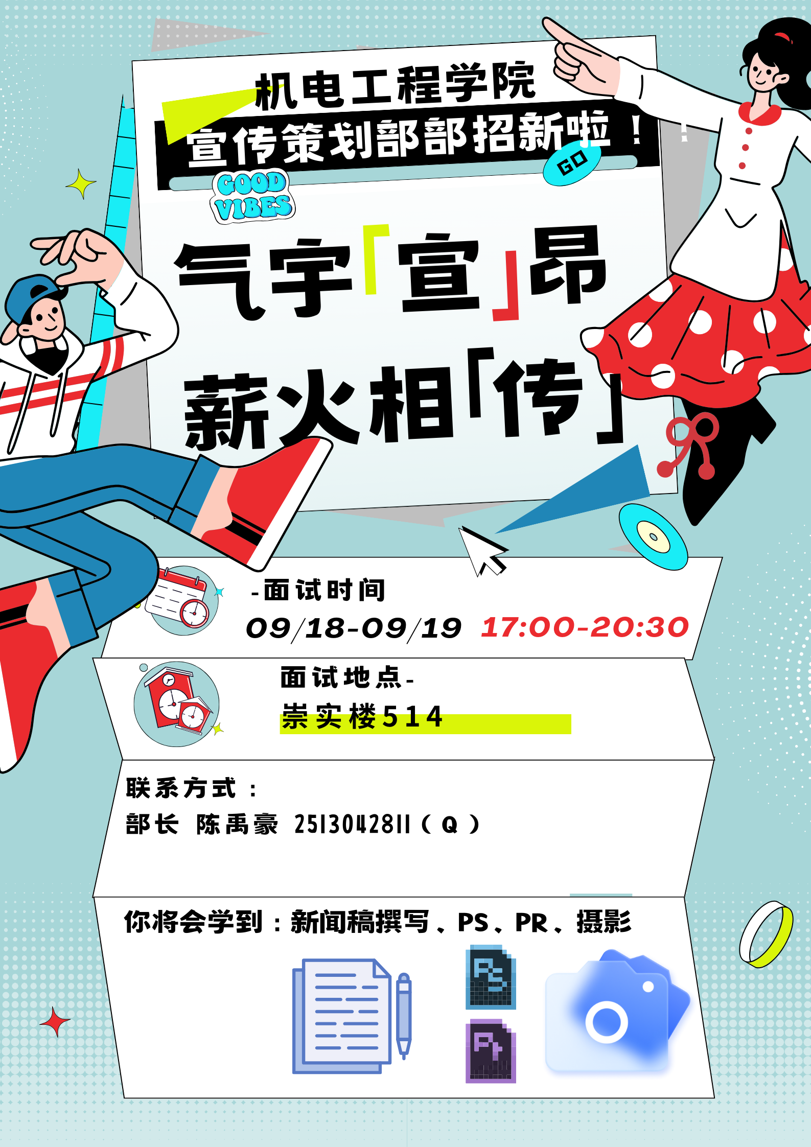 宣传策划部主要职责:活动海报的制作、活动视频的制作、进行活动照片的采集、新闻稿的撰写、学院公众号的管理,签到表的绘制。