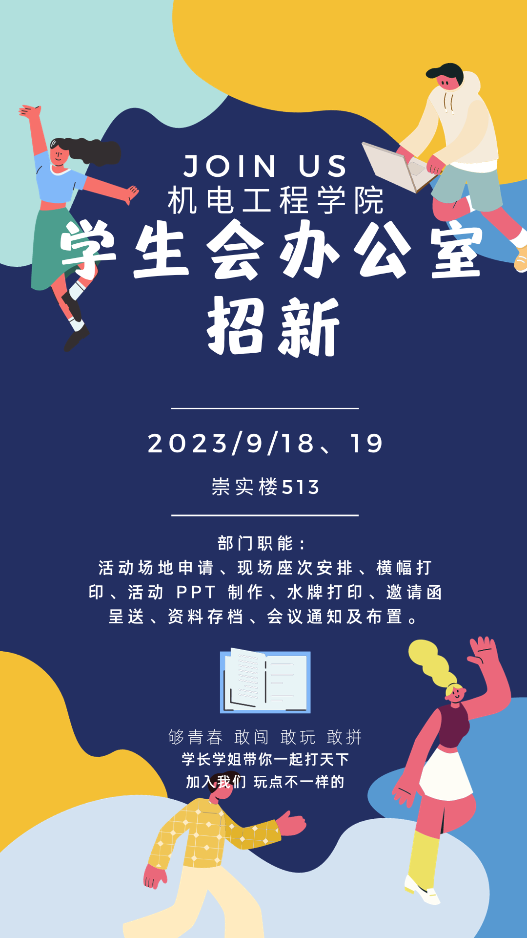 学生会办公室主要职责:活动场地申请、现场座次安排、横幅打印、活动 PPT 制作、水牌打印、邀请函呈送、资料存档、会议通知及布置。