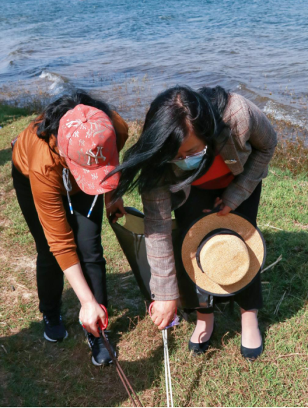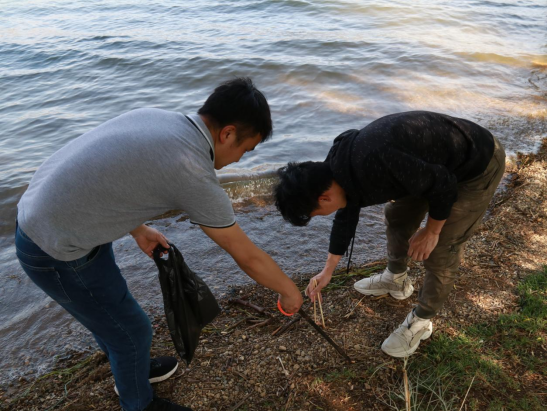 活动开始,大家共同来到胡家村阳宗海段,先后领取了钳子、垃圾袋等工具。在各支部书记的带领下,分成多个小组,进行了现场环境及水质的调查。大家两人一组,徒步在河边及草丛里翻捡垃圾,小心翼翼地清理发霉的烟头、风化的卫生纸、干瘪的水瓶、污迹满满的塑料袋等。虽然天气炎热,但是大家依旧干劲儿十足,不放过任何一个角落。