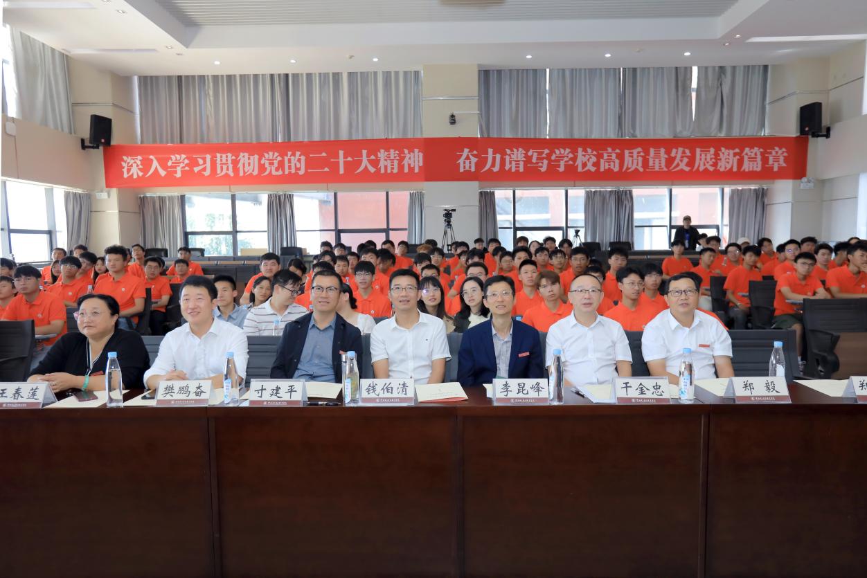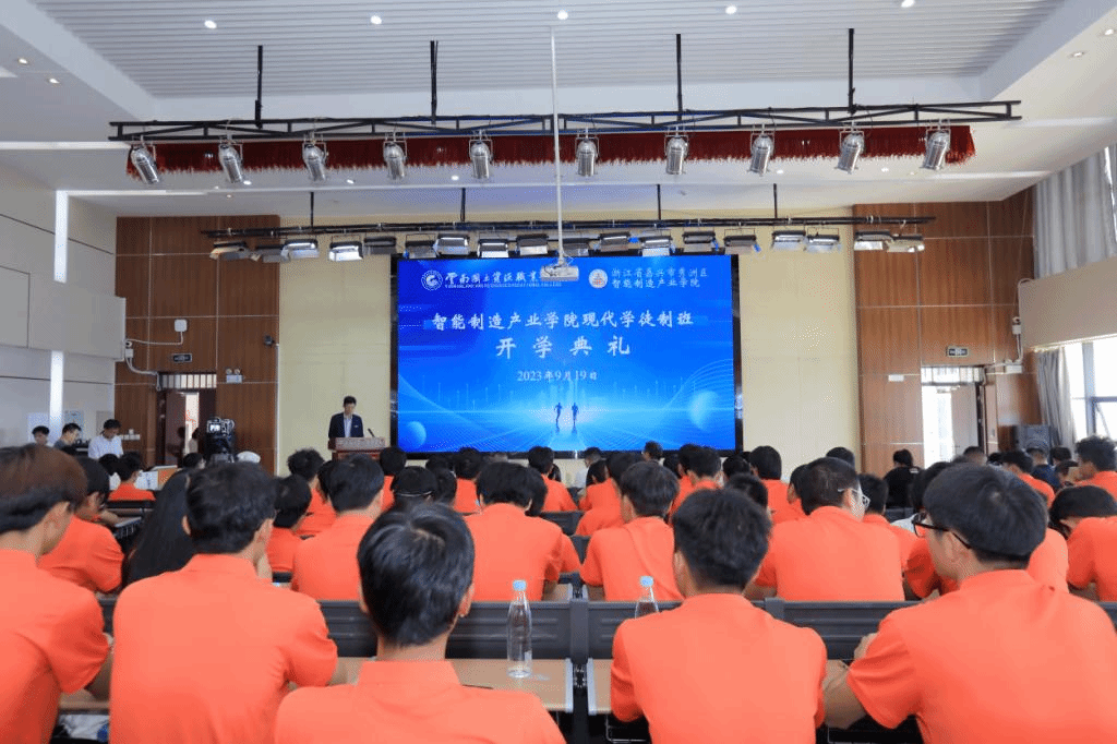 2023年9月19日,我校智能制造产业学院在阳宗海校区宝鼎讲堂成功举行现代学徒制班第一期新生开学典礼。本次开学典礼由世界杯体育官方网站院长张俊妍主持,嘉兴市秀洲区人力资源和社会保障局副局长钱伯清、学校党委副书记李昆峰、学校副校长寸建平、学校教务处处长郑毅、嘉兴市秀洲区金慧大学生社会工作服务中心代表、嘉兴市秀洲区企业代表、世界杯体育官方网站教师代表共同参加了此次开学典礼。